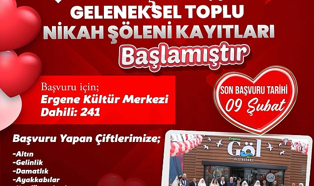 Ergene Belediyesinden yapılan açıklamada; “14 Şubat geleneksel toplu nikah şöleni kayıtları başlamıştır. Kayıtlar 09 Şubat 2024 tarihinde kadar Ergene Belediyesi Kültür Merkezinde alınacaktır. Başvuru yapan çiftçlerimze; Altın, gelinlik, damatlık, ayakkabılar, kuaför ve berber hizmetleri, Aile Cüzdanı, ikram ve nikah şekeri belediyemizin hediyesi olacak” denildi.