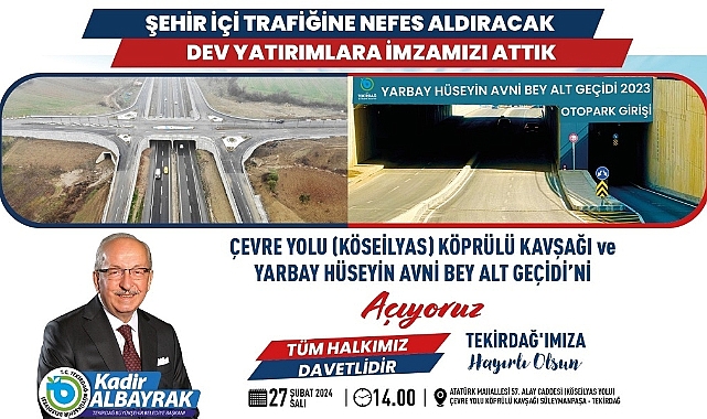 Tekirdağ genelinde rahat bir ulaşım ağı oluşturmak amacıyla çalışmalarını titizlikle sürdüren Tekirdağ Büyükşehir Belediyesi tarafından Süleymanpaşa ilçesinde trafiği önemli ölçüde rahatlatacak ve önemli noktalar için bağlantı noktası görevi görecek Çevreyolu (Köseilyas) Köprülü Kavşağı ile Yarbay Hüseyin Avni Bey Alt Geçidi’nin açılışı, 27 Şubat Salı günü gerçekleştirilecek.