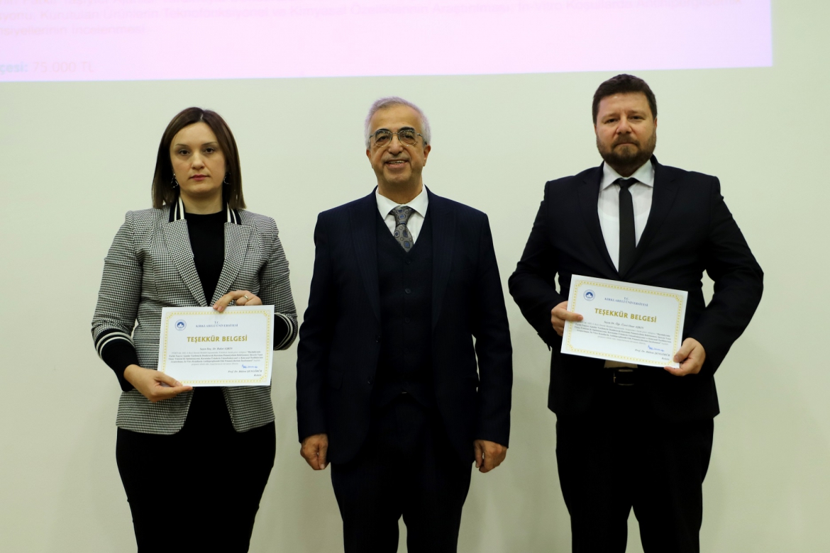 Kırklareli Üniversitesi, Üniversite 2. Merkezi Derslikler Binası 1 No’lu Konferans Salonu'nda, Proje Geliştirme ve Koordinasyon Ofisi'nin (PGKO) Tanıtım Günü ve 2023 Yılı Projeleri Tebrik Belgeleri Takdim Töreni'ne ev sahipliği yaptı. Etkinlik, büyük bir coşku ve heyecanla gerçekleşirken Üniversitenin önde gelen isimleri, Rektör Prof. Dr. Bülent Şengörür, Rektör Yardımcısı Prof. Dr. Meryem Çamur Demir ve Proje Geliştirme ve Koordinasyon Ofisi Başkanı Öğr. Gör. Çiğdem Ovacı Beji gibi isimlerin katılımıyla renklendi.Tören, PGKO'nun önemine vurgu yapan açılış konuşmalarıyla başladı. Rektör Prof. Dr. Bülent Şengörür, yaptığı açılış konuşmasında PGKO'nun kuruluşundan bu yana elde ettiği büyük başarıları ve katılımcıların gösterdiği yoğun çabayı vurgulayarak, "Bu sene 81 proje başvurusu ile ciddi bir rakama ulaştık. Her geçen yıl destek verilen proje sayısının arttığını görüyoruz. Bu rakamlar, arkadaşlarımızın gösterdiği çabanın bir göstergesi. Çalışmalarınız ve gayretleriniz için sizlere teşekkür ediyorum. Gelecek yıl da aynı gayreti göstererek hem başvuru sayısını hem de başvuruların kabul oranlarını artırmayı hedefliyoruz. Daha iyi seviyelere gelmek için elimizden gelen gayreti göstereceğiz" şeklinde konuştu.Açılış konuşmalarının ardından, Öğr. Gör. Dr. Yasemin Keşkek Karabulut, Proje Geliştirme ve Koordinasyon Ofisi'nin yıllık faaliyetlerini içeren bilgilendirme sunumunu gerçekleştirdi. Sunumun sonrasında Rektör Prof. Dr. Bülent Şengörür, araştırma projeleri yürüten akademisyen ve öğrencilere verdikleri emek ve katkılardan dolayı tebrik belgelerini takdim etti.Programa, Rektör Yardımcısı Prof. Dr. Meryem Çamur Demir, Gıda Ar-Ge İnovasyon ve Girişimcilik Uygulama ve Araştırma Merkezi Müdürü Prof. Dr. Hatice Şanlıdere Aloğlu, Proje Geliştirme ve Koordinasyon Ofisi Başkanı Öğr. Gör. Çiğdem Ovacı Beji, birim yöneticileri ve akademik personel de katılım gösterdi. Katılımcıların hatıra fotoğrafı çektirmesiyle tören sona erdi.FOTOĞRAF: Kırklareli ÜniversitesiHABER: Umut AL