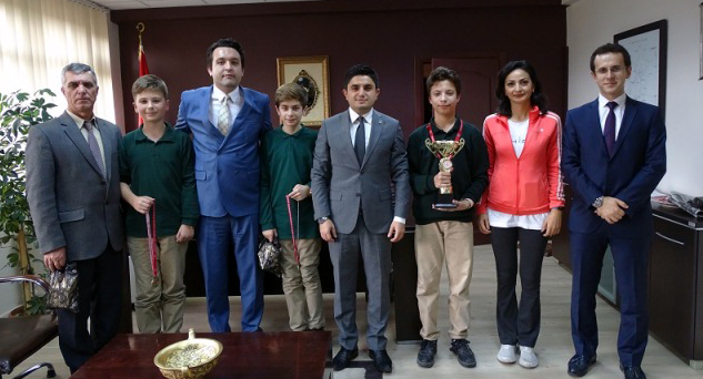 Kırklareli’deki Dart Şampiyonasında 1’inci olan Kaynarca Ortaokulu Öğrencileri Pınarhisar Kaymakamı Soner Divli’yi makamında ziyaret etti